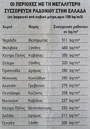 (Σύμφωνα με τις εκτιμήσεις του εργαστηρίου Ιατρικής Φυσικής της Ιατρικής Σχολής Αθηνών, περίπου 44 στους 10.000 κατοίκους στην Ελλάδα αναπτύσσουν θανατηφόρο καρκίνο του πνεύμονα, λόγω ραδονίου).